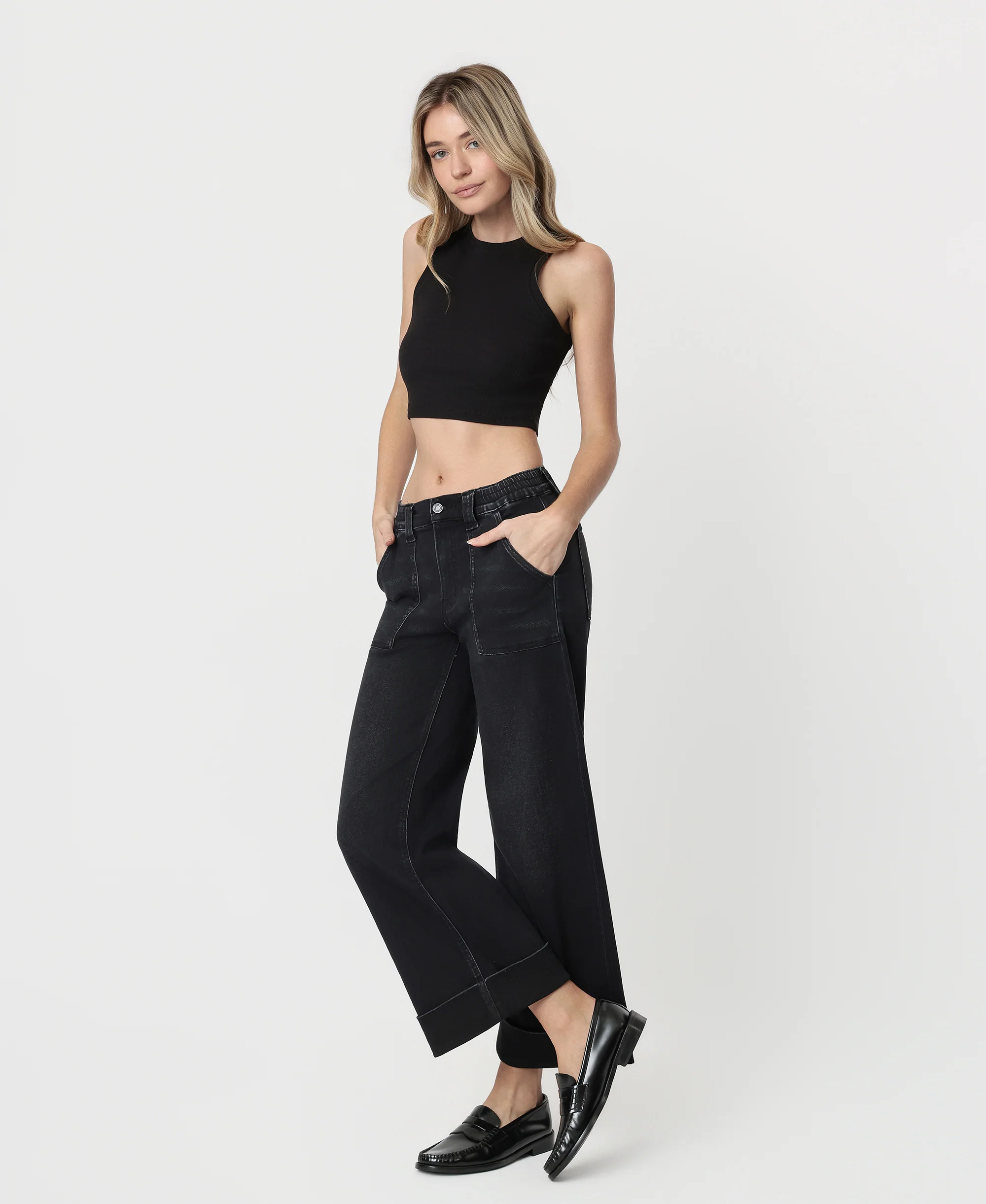 Black - High Rise Cuffed Baggy Wide Leg Jeans