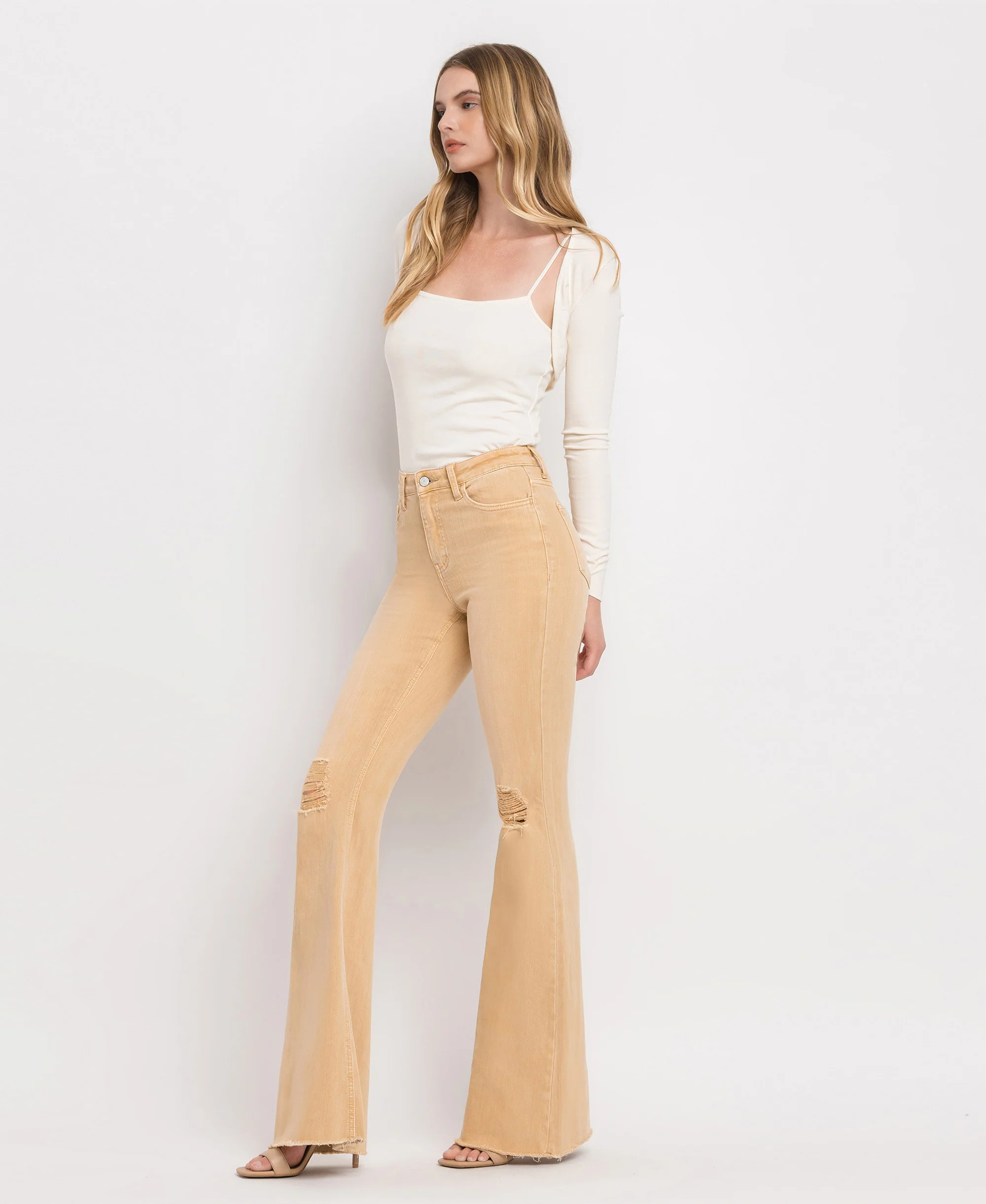 Slay all day in our Dew Drop flare jeans. These high rise beauties feature comfort stretch denim for a flawless fit. With distressed details and a fierce raw hem, you'll be rocking that full length and flared look with ease.