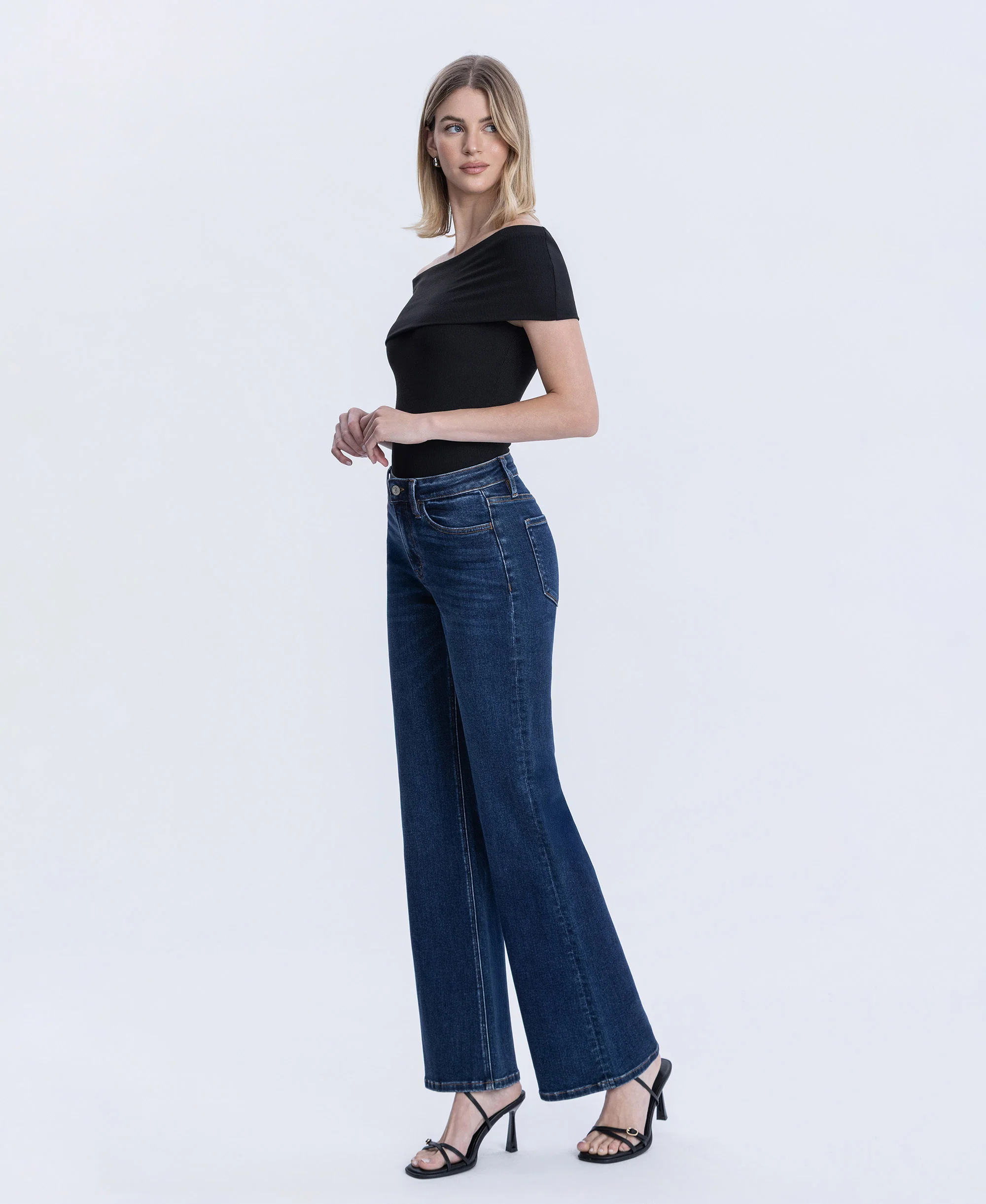 The Lingering High Rise Vintage Flare Jeans offer stretch comfort, a flattering high waist, and a stylish vintage flare. Finished with a dark wash and five pockets, they combine classic design with everyday ease.