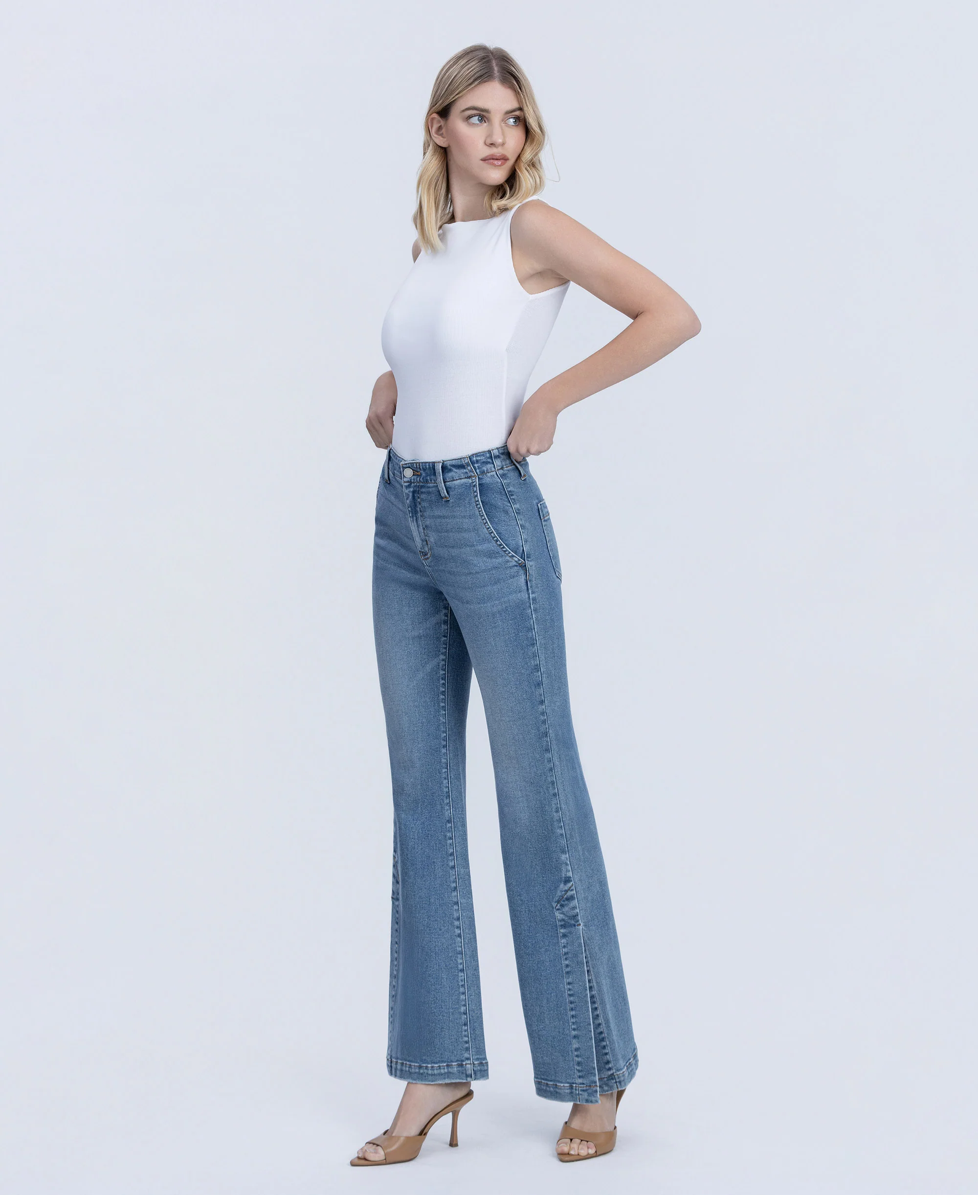 Lustre High Rise Slit Hem Easy Flare Jeans deliver bold confidence with a daring silhouette. Crafted from comfort stretch denim, these full length flares feature a high rise waist that commands attention, paired with a modern side slit hem for an edgy finish. Functional front slit pockets and back patch pockets keep you covered, while the waist facing ensures a smooth, flattering fit.