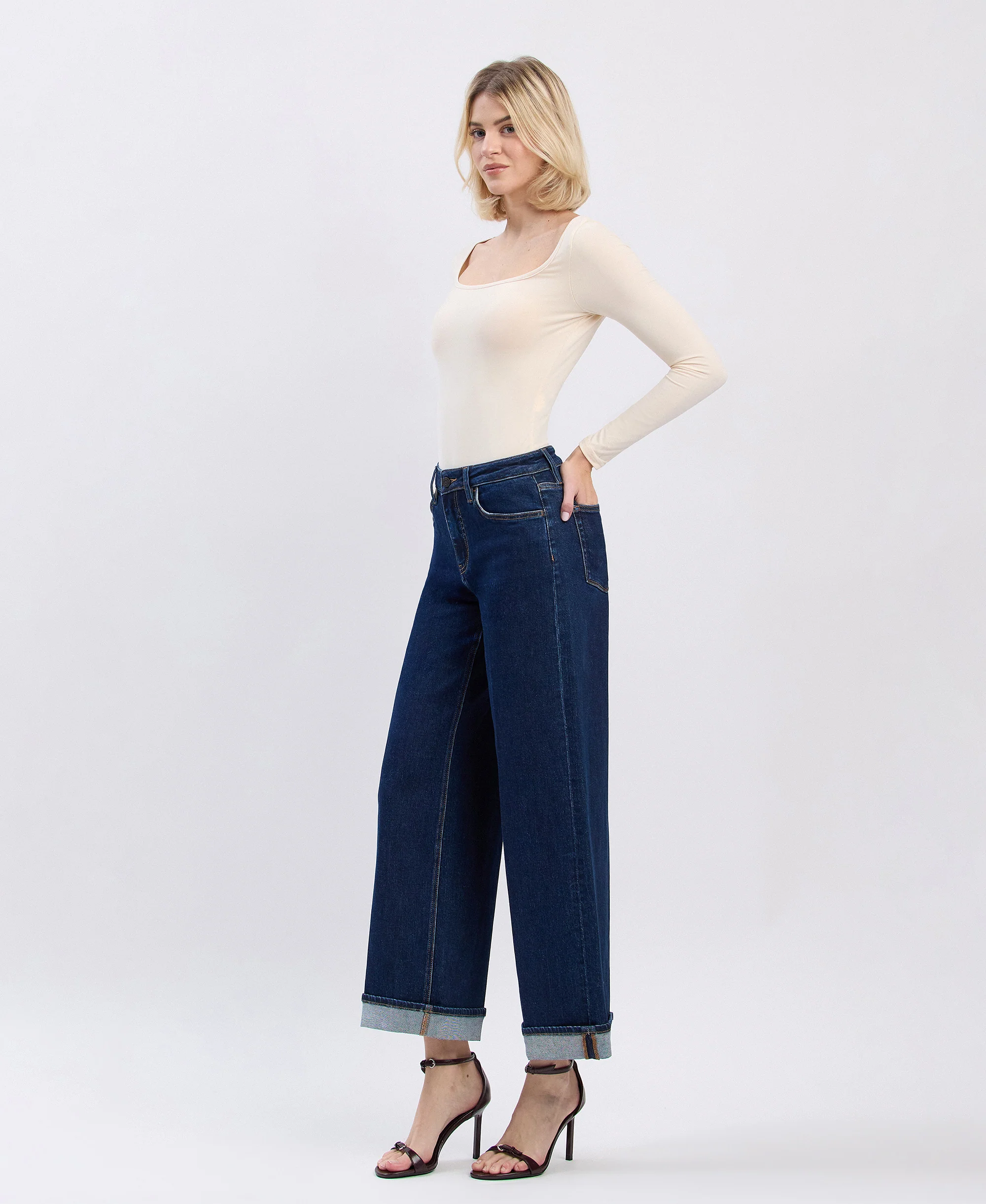 Reward - High Rise Tab Cuffed Ankle Wide Leg Jeans