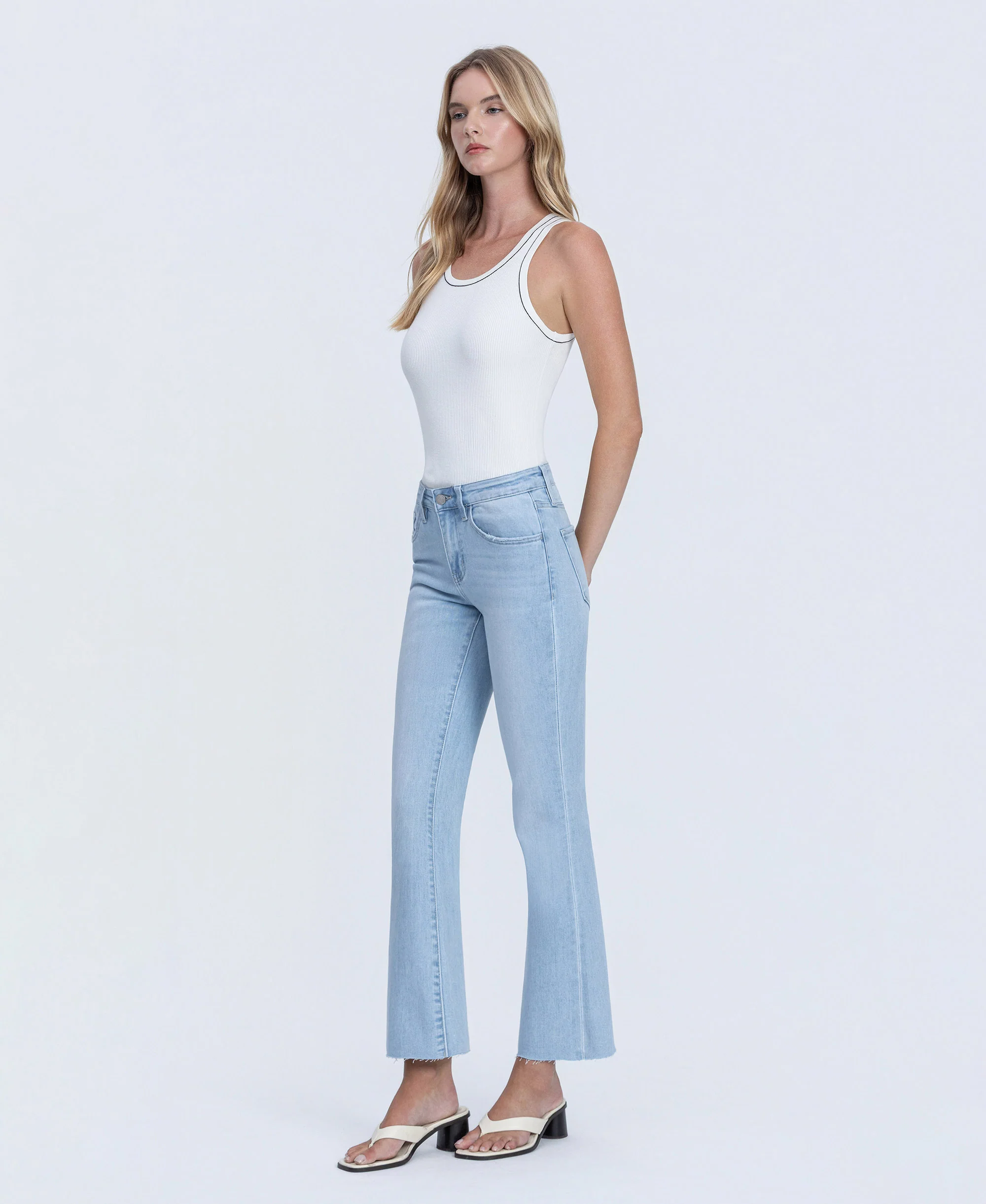 Made from soft stretch denim, these jeans move with you while shaping your silhouette. The mid rise waist offers a flattering fit, complemented by a trendy raw hem and classic 5 pocket design. Finished in a light wash and ankle length, these bootcut jeans add a fresh, modern touch to any outfit, making them a must-have for your wardrobe.
